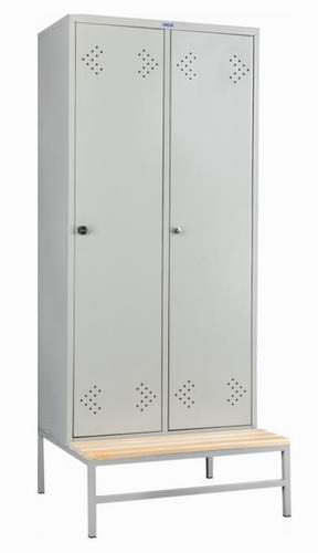 На подставку устанавливается шкаф раздевальный. Шкаф прикручивается к подставке. Цвет серый полуматовый (RAL 7038).
