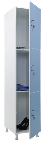 Шкаф для офиса WL 14-30 Шкаф из ЛДСП для личных вещей, размеры внешние (ВхШхГ) 1900x300x500 мм, вес 32 кг, 4 отделения, цвет голубой/белый. Ключевой замок. Поставляется в разобранном виде. Гарантия 1 год.