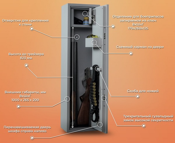 Предназначен для хранения огнестрельного оружия дома. Оружейный шкаф полностью соответствует требованиям изложенным в статье 59 Постановлении Правительства России от 21 июля 1998 г. № 814 «О мерах по регулированию оборота гражданского и служебного оружия и патронов к нему на территории Российской Федерации» и приказу МВД ПРИКАЗ от 12 апреля 1999 г. N 288
