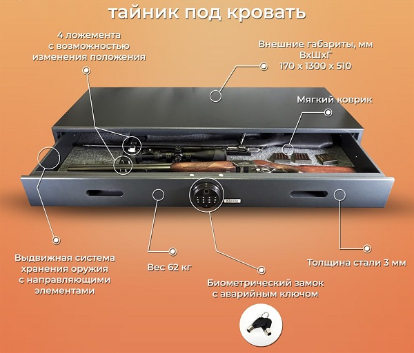 Предназначен для хранения огнестрельного оружия. Благодаря своим размерам данная модель оружейного шкафа(тайника) позволяет скрытно разместить для оружие для хранения под кроватью. Что очень удобно, т.к. экономится место и оружие всегда под рукой.