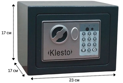 Сейф мебельный Klesto 17EW Производитель Klesto, размеры внешние (ВхШхГ) 170х230х170 мм, размеры внутренние (ВхШхГ) 167х227х110 мм, вес 2.6 кг, объем 5 л, запирающая система: электронный замок с ключом аварийного открывания. Гарантия 1 год.