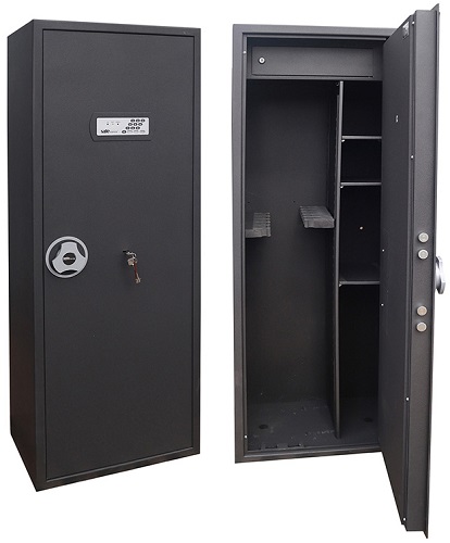 Сейф оружейный Safetronics TSS 160ME/K3 Производитель сейфа Safetronics, внешние размеры (ВхШхГ) 1560х600х435 мм, внутренние размеры (ВхШхГ) 1390х560х342 мм, вес 236 кг, запирающая система электронный кодовый замок Safetronics и ключевой замок аварийного открывания (Kaba Mauer, Германия), вместимость 3 ружья