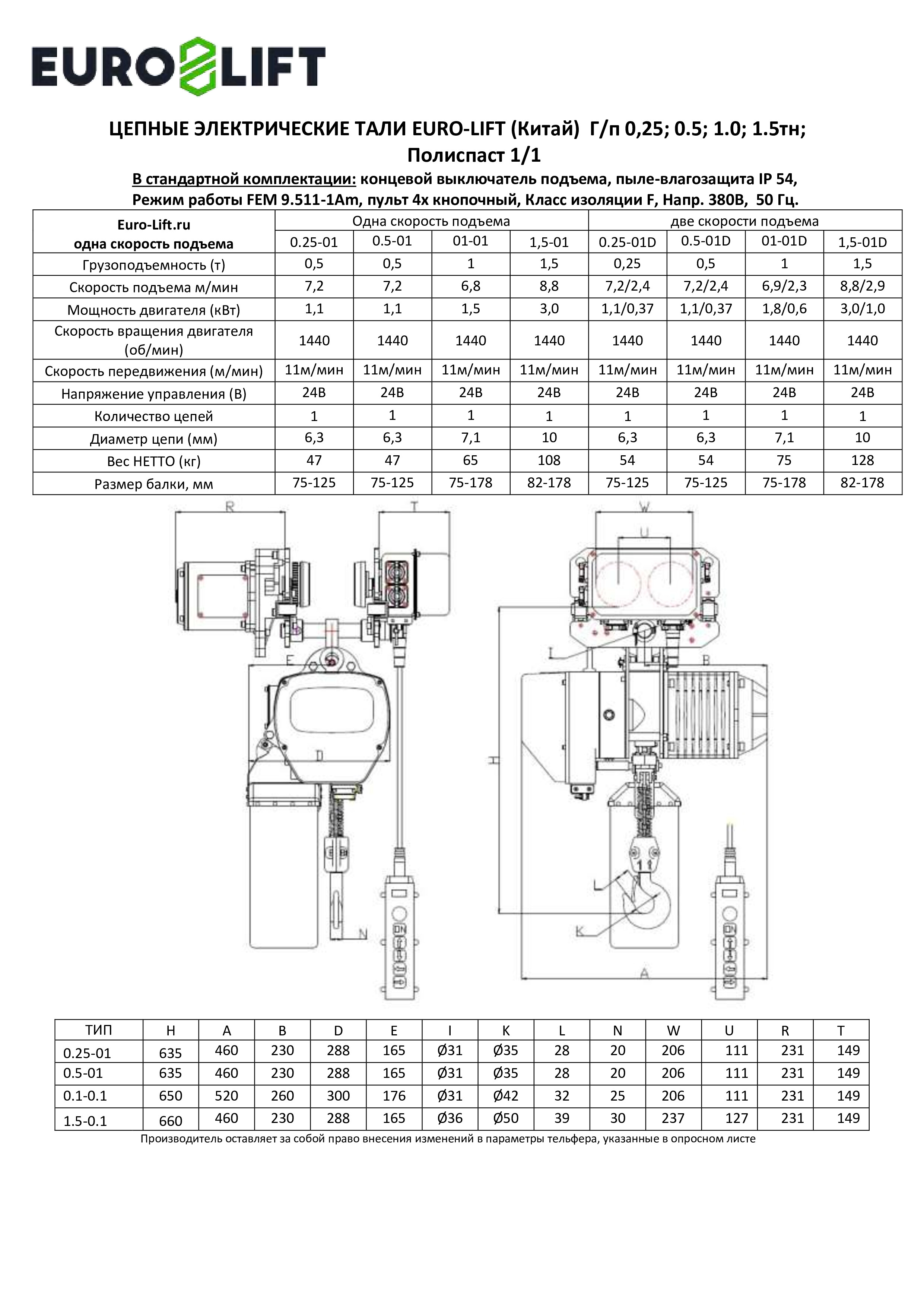 Таль электрическая цепная Euro-Lift HHBB 2/3 г/п 2 т, в/п 3 м