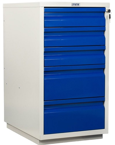 Верстак состоит из тумб WD1 и WD5. Тумба WD1 укомплектована 2-мя съемными регулируемыми полками и 1 дверцей, возможность смены стороны открывания двери. Ключевой замок на дверце тумбы. Нагрузка на полку 30 кг. Тумба WD5 укомплектована 5-ю выдвижными ящиками. Ящики открываются на телескопических направляющих. Нагрузка на ящик 30 кг. Все ящики закрываются на центральный ключевой замок.